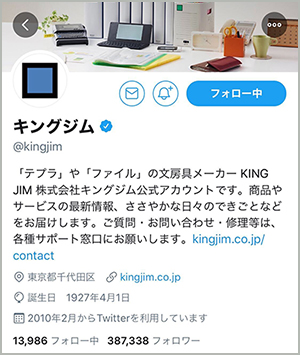 まずは、「テプラ」や「ファイル」の文房具メーカーでおなじみの「キングジム」のツイッター(@kingjim)。2010年からツイッターの運用がスタートし、今では38.7万(5月20日時点)のフォロワーを誇る人気アカウントです。