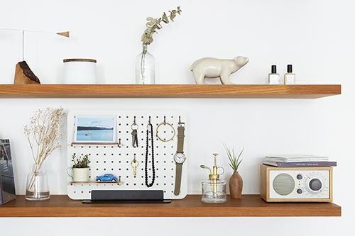 組み立てはペグボードをスタンドに差し込むだけと簡単なので、誰でもすぐに使い始めることができます。鍵などを引っかけるL字フックや、カードや付箋などを入れるミニコンテナ、ペンスタンドなど、別売りのパーツを自由に組み合わせることで自分好みの収納が楽しめます。
