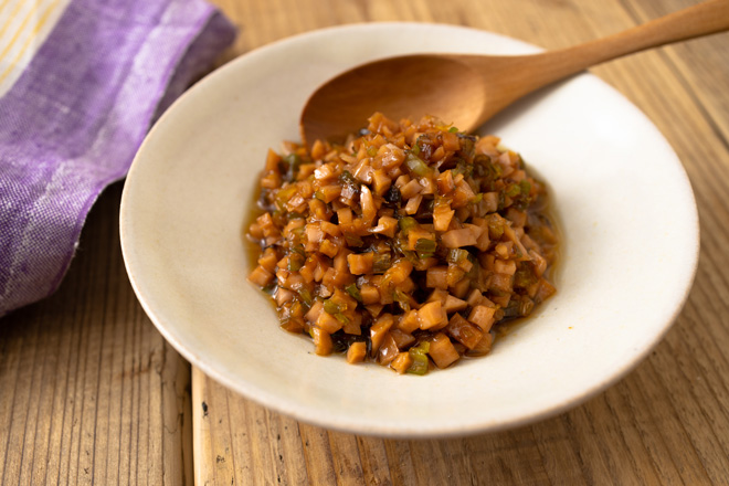 「ご飯はもちろん、うどんやラーメンなど様々な料理の“ちょいかけ”に相性抜群な肉味噌を『おさかなのソーセージ』で 代用。切って炒めるだけの簡単15分レシピで料理初心者の方にもおすすめです。お弁当のおかずやおつまみにも活躍するため、作り置きにも便利なおたすけレシピです」