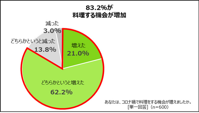 「あなたは、コロナ禍で料理をする機会が増えましたか」という質問に、83.2%の人が「増えた」もしくは「どちらかというと増えた」と回答しました。