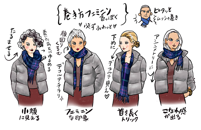 パリでは巻き方達人があちらこちらに! 顔まわりの装いのせいか、その誰もが色っぽいんですよね。イラストを参考に、ふわっとさせてみると実感するはず。スカートはタイトなボルドー。「下半身痩せ」にもなります。格好いいマダムの足もとに欠かせないのがヒール。やわらかで歩きやすいブーツがおすすめです。