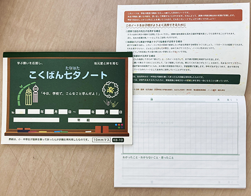 「こくばん七夕ノート」は、仙台の七夕祭りで飾られた折り鶴を再生利用した黒板型学習ノートです。たくさんの子どもたちが一生懸命折った鶴に込められた思いを再生しました。