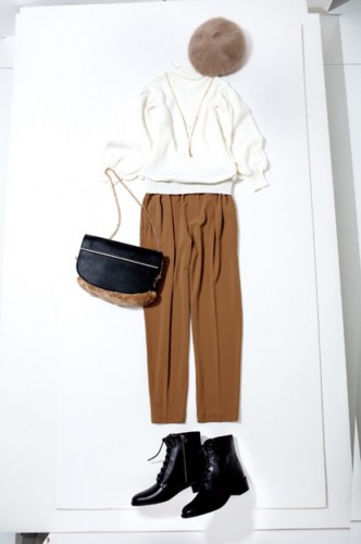 そんな方は、写真のようにトップスの裾にリブが入ったニットでもいいかもしれませんね。全部がピタッとする必要はなく、ゆるさの中にピタッとした引き締めを作るのがコツなんです。