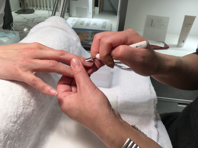 キューティクルプッシャーでルースキューティクルと甘皮を押し上げ、取り除いていく。