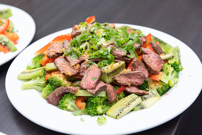 5.ブロッコリーサラダとキウイとスライスしたビーフステーキを盛り付ける。