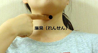 「廉泉」の「廉」には角(すみ)または舌、「泉」には水源という意味があり、必要なエネルギーが泉のように湧き出る場所にあるツボを表しています。舌の炎症、唇のふちのできもの、舌の知覚異常、舌のもつれ、また、せきやたんなどを緩和するように働きます。